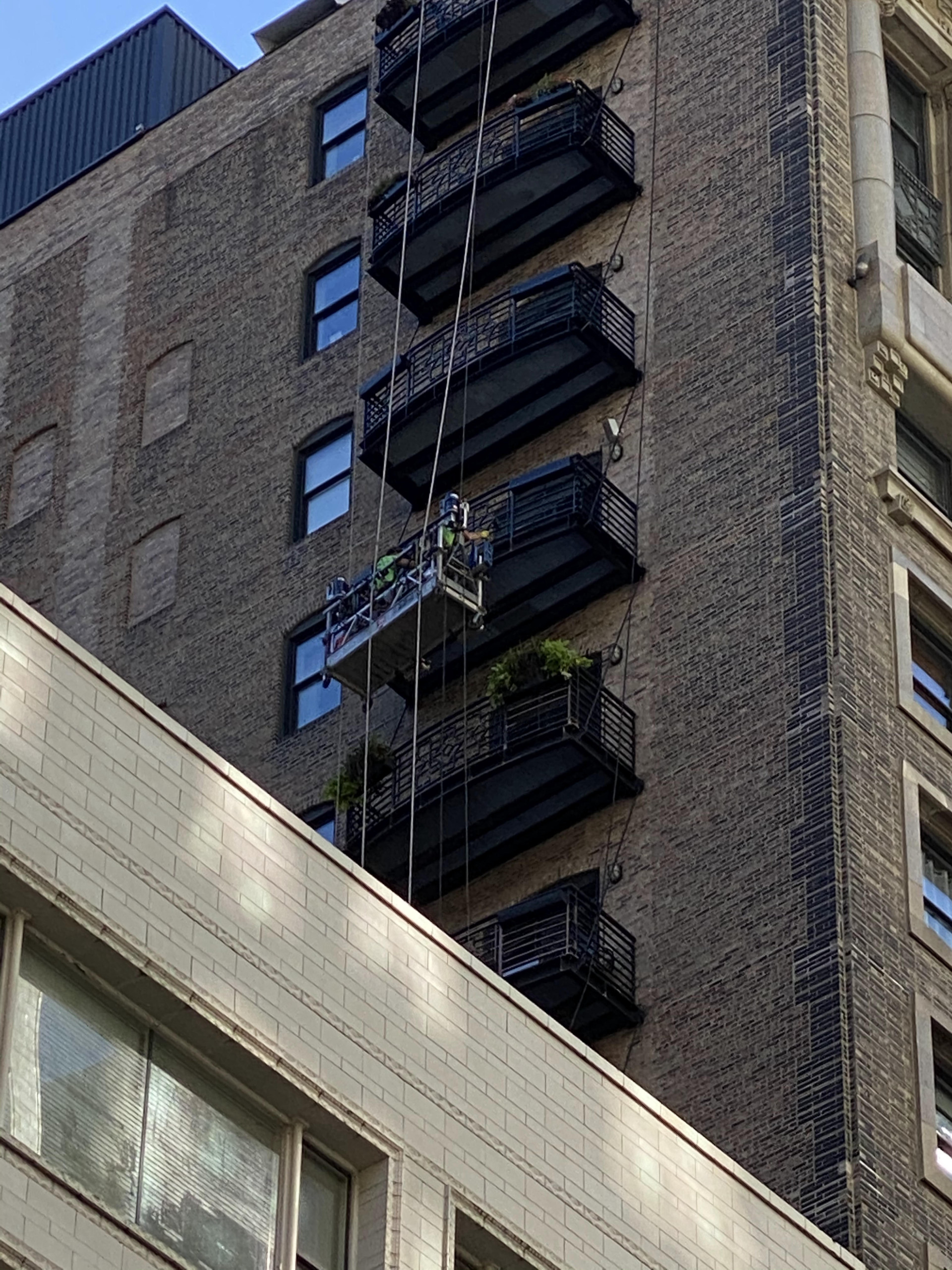 This Chicago HOA client is the owner of a 14-story building and the balconies needed a new coat of paint. Working from swing stages, our crew was able to maneuver around the exterior of the building, applying coats of Sherwin Williams Urethane Alkyd to the many different components of the balconies. The Urethane Alkyd paint is a perfect selection because it looks great and fully protects the metal components of the balcony.