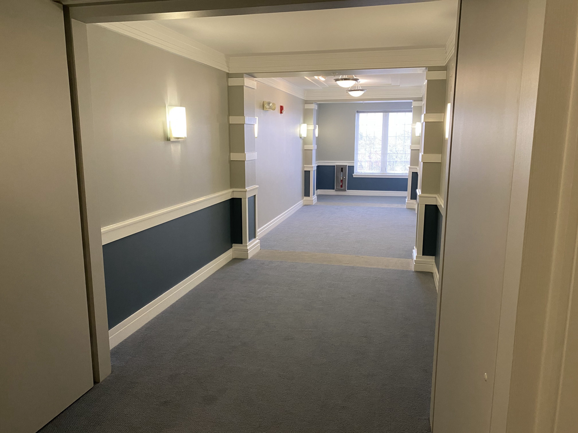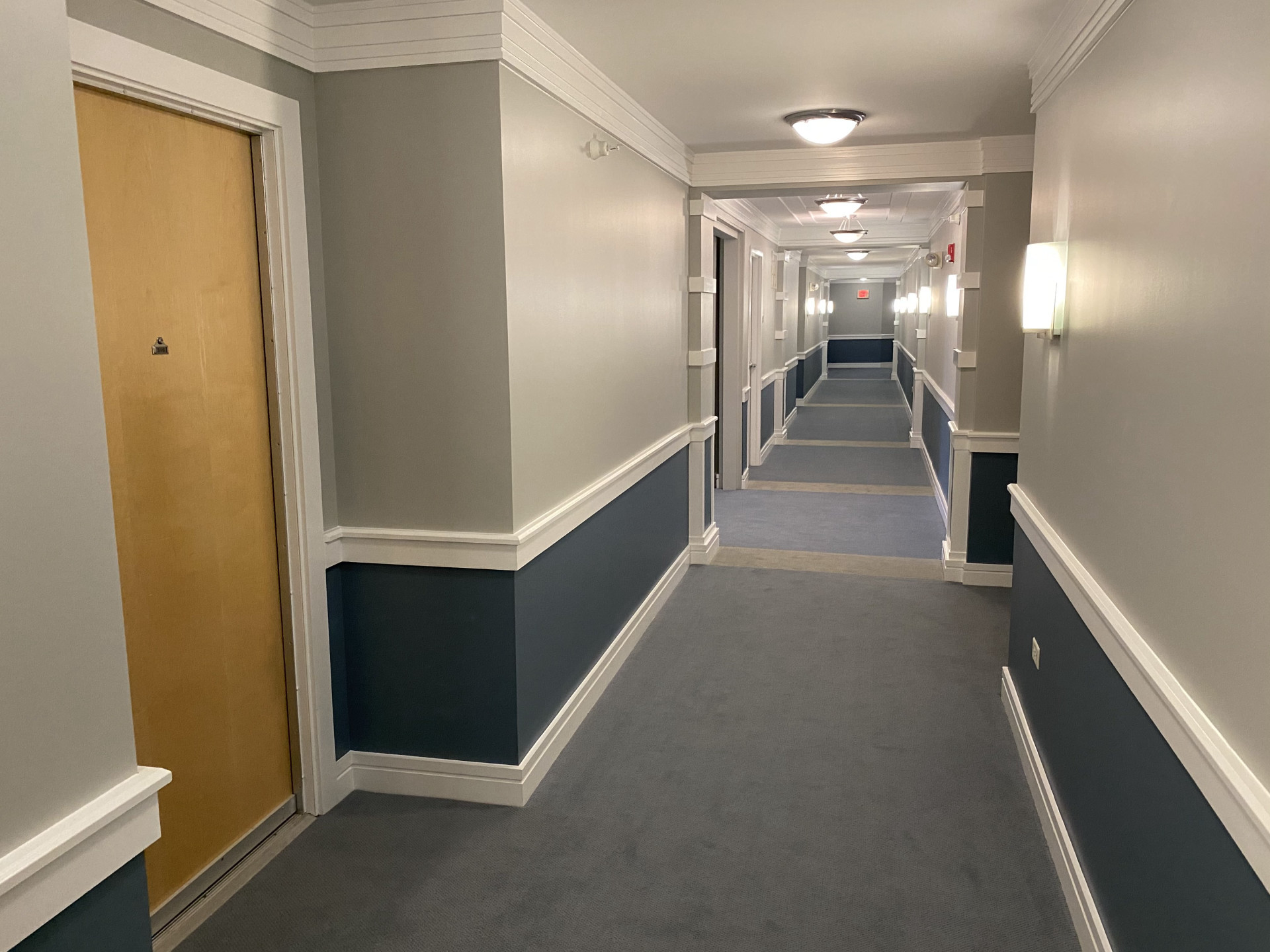 This interior hallway repainting project came in as a higher complexity project, not only because of its size, but because it is a high-quality building where finishes are also expected to be of equal or higher quality. The job required painting ceilings, walls, doors, trims and baseboards using multiple colors of Benjamin Moore Scuff-X paint, which also added to the complexity of the project.