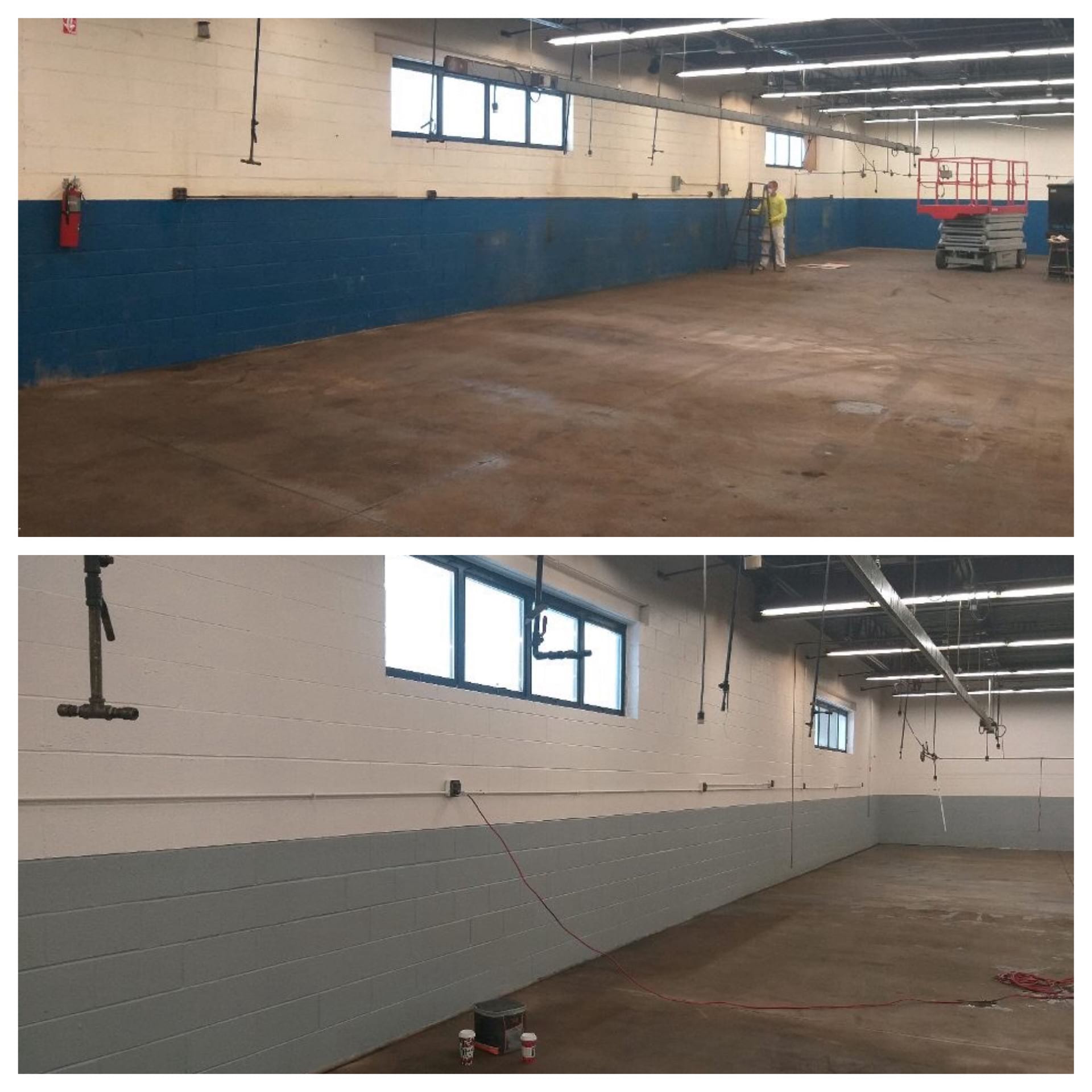 Warehouse interiors often require a vast knowledge of painting materials to provide the proper aesthetic and durability. We chose Sherwin Williams Macropoxy 646 Fast Cure Epoxy, SW Industrial Enamel, SW Concrete Sealer, SW Oil Primer and SW Promar 200, all of which were perfect choices for a job like this.